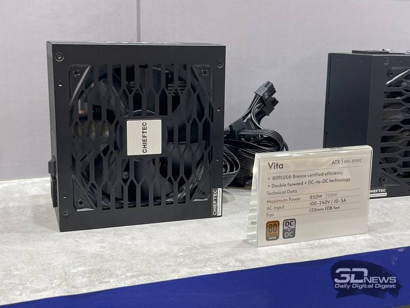 A Chieftec também mostrou algumas novas fontes de alimentação. O modelo Atmos é uma fonte de alimentação ATX clássica, oferecida nas versões de 750 e 850 W. Está em conformidade com as especificações ATX 3.0 e PCIe 5.1 e está equipado com um conector de alimentação 12V-2×6 para placas de vídeo. Um esquema de conexão de cabo completamente modular é usado aqui. Internamente: linha única de +12V, eficiência 80 Plus Gold, circuito DC-DC em linhas de 5V e 3,3V.