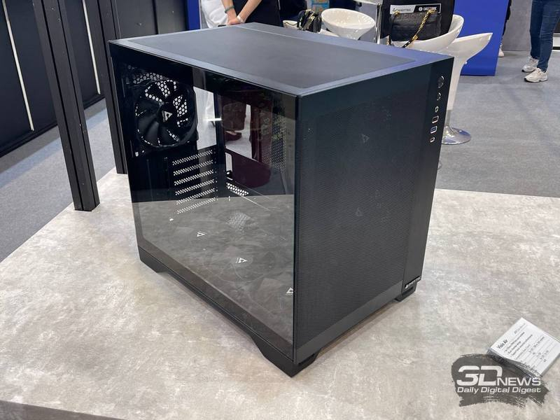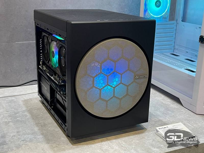 Para os fãs de sistemas mais compactos, a Chieftec oferece o Pro Cube 2, que parece um subwoofer devido à grande abertura redonda no painel frontal. Atrás deste buraco está uma grande ventoinha de 200 mm. Outra característica do gabinete é que uma placa-mãe de tamanho até Micro-ATX é instalada na borda inferior, ou seja, na posição horizontal, e não como de costume. No interior há espaço para placas de vídeo de até 32 cm de comprimento e coolers para processadores de até 16 cm de altura.