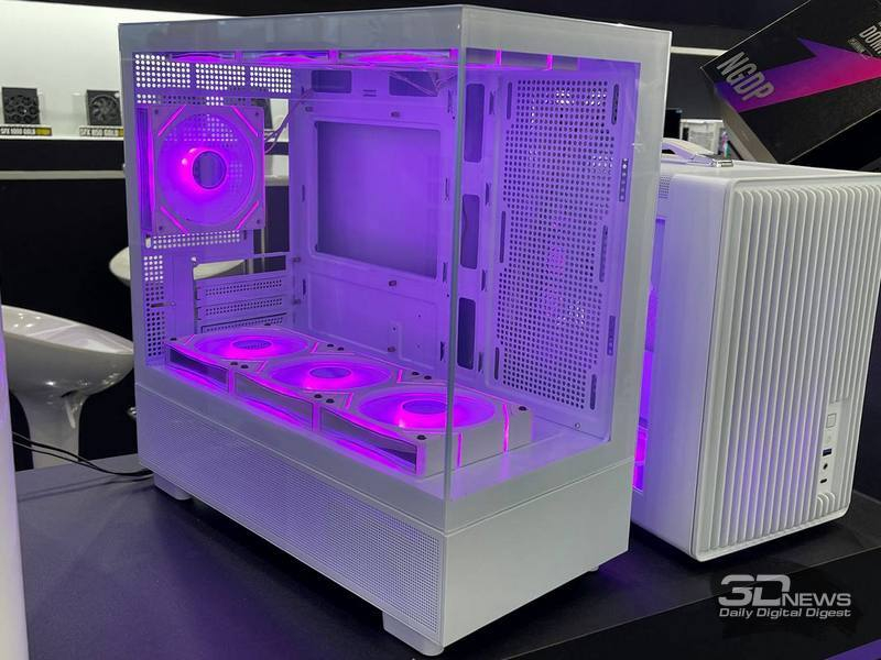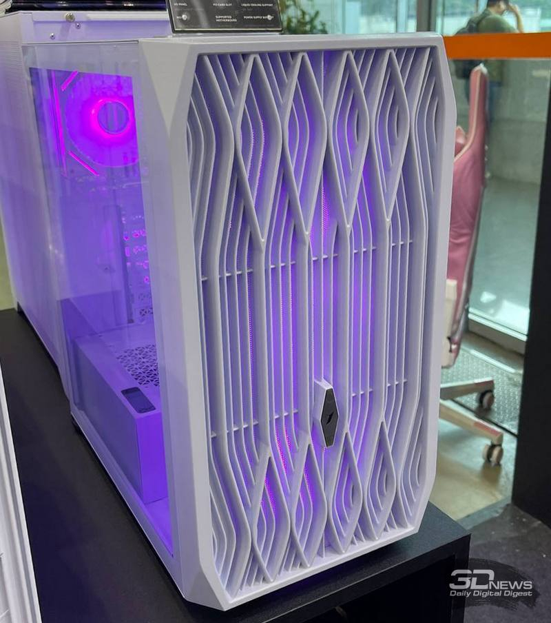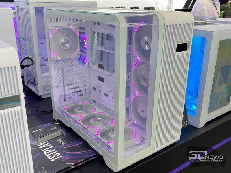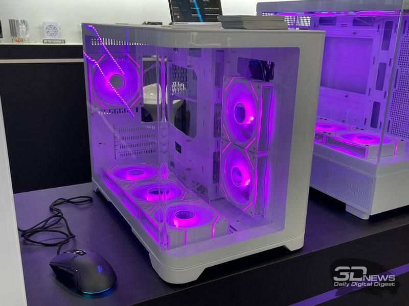 Os modelos acima têm formato mais próximo de um cubo, mas no 1stplayer também existem “torres” clássicas. Por exemplo, na exposição foi apresentado o case Mi5, cujas paredes frontal e lateral também são de vidro temperado e não há suporte entre elas. Este gabinete acomoda placas-mãe Micro-ATX, coolers para processadores de até 165 mm de altura e placas de vídeo enormes de até 420 mm de comprimento. Você também pode colocar até nove ventoinhas de 120 mm e LSS com radiador de até 360 mm aqui.