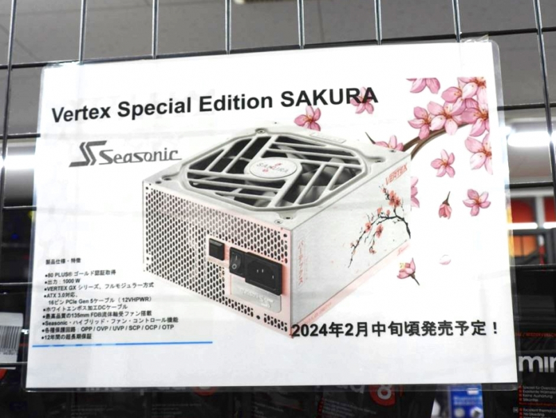 Recentemente, a fonte de alimentação Seasonic Vertex Sakura foi exibida no Japão. O novo produto é baseado no modelo Vertex-GX-1000 com potência de 1000 W. A fonte de alimentação possui certificação 80 Plus Gold, indicando sua alta eficiência.