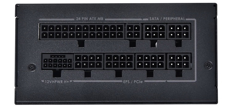 A fonte de alimentação está equipada com cabos totalmente modulares. O pacote inclui um cabo de alimentação principal de 24 pinos da placa-mãe, dois cabos 4+4 EPS para alimentação da CPU, um cabo de alimentação 12VHPWR de 12+4 pinos, dois cabos PCIe 6+2, oito cabos SATA, três Molex e um disquete .