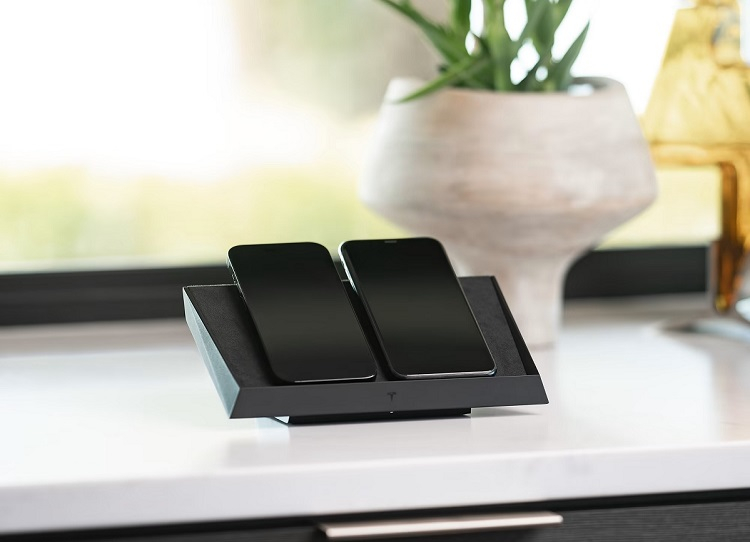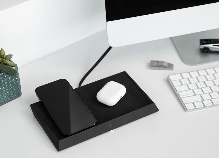 A plataforma de carregamento sem fio recebeu uma caixa metalizada angular, segundo a Tesla – no estilo do Cybertruck. O modelo oferece carregamento sem fio com potência de até 15 W e é capaz de carregar cada um dos três aparelhos ao mesmo tempo com esta potência.