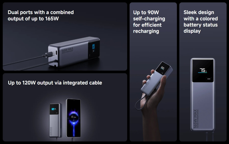 Por sua vez, o Xiaomi 165W Power Bank 10000 inclui quatro células de bateria com capacidade de 2500 mAh cada. O dispositivo fornece 120 W de potência de saída por meio do cabo USB Tipo C integrado, e a potência total de saída por meio das duas portas USB Tipo C é de 160 W. O banco de potência permite carregar simultaneamente dois dispositivos com potência de até 120 W e 45 W, o que é mais adequado para smartphones, tablets e laptops.