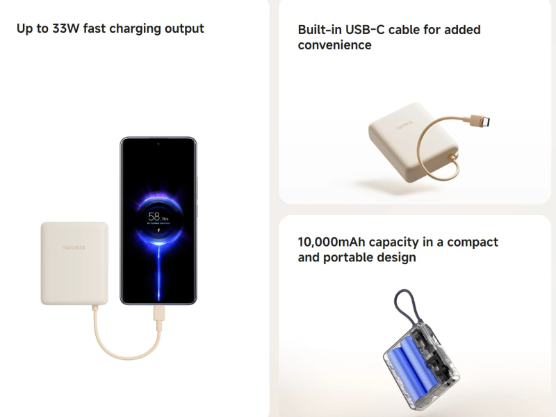 O dispositivo possui outra porta USB Tipo C para carregamento rápido de 33 W, além de uma porta USB Tipo A com suporte para distribuição dinâmica de energia de até 22,5 W por dispositivo. O Xiaomi 33W Power Bank 10000 está equipado com duas células de bateria com capacidade de 5000 mAh cada, bem como um chip de identificação inteligente integrado para comparar automaticamente a corrente de saída com o desempenho de vários dispositivos.