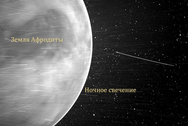Na foto, a mancha escura no centro do planeta é a Terra de Afrodite, o maior dos três vastos “continentes” (elevações) de Vênus, perto da África da Terra. O objeto parece escuro devido à sua temperatura mais baixa: cerca de 30 graus Celsius em comparação com seus arredores. Uma borda luminosa brilhante é claramente capturada ao redor da borda do disco do planeta. Aparentemente, este é o brilho noturno da atmosfera, que ocorre durante a recombinação de átomos de oxigênio em moléculas, que ocorre no alto da atmosfera no lado escuro.