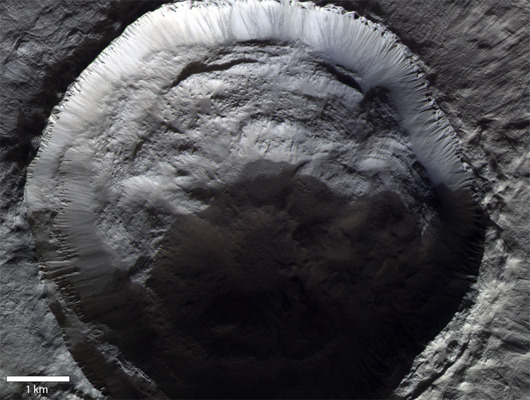 Esta imagem mostra uma cratera com cerca de 6 km de diâmetro. Na foto, metade da formação está bastante bem iluminada, enquanto a outra metade está na sombra.
