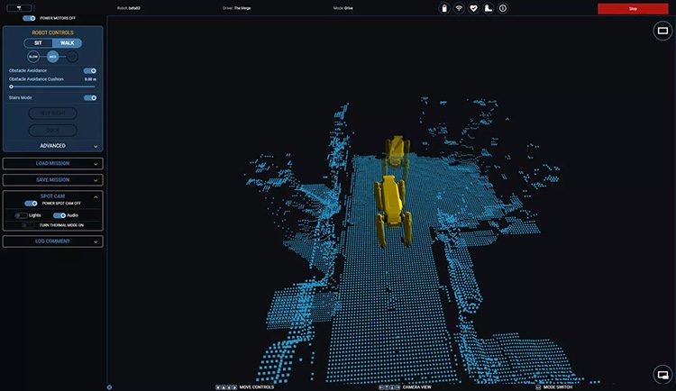 E antes, era possível controlar o Spot pela Internet usando software de terceiros. Mas o Scout é o primeiro software de navegador otimizado da empresa. O jornalista Verge tentou controlar o robô Spot Enterprise por meio de tal sistema a uma distância de 5000 km. A interação era bastante lenta, mas ainda assim o robô era bastante controlável usando o layout WASD familiar (controladores também são suportados). Ou você pode simplesmente indicar com o cursor os pontos para os quais o robô vai sozinho. Os controles são como um videogame de baixa resolução em um serviço de streaming lento. Houve atrasos perceptíveis entre o pressionamento do botão e a resposta, mas com a tecnologia de eliminação de obstáculos embutida do Spot, tudo funcionou bem, inclusive ao subir escadas. Você pode transferir completamente o controle para o robô nos casos em que ele patrulha a mesma rota todas as vezes. O operador pode programar isso com antecedência, incluindo carregamento automático entre caminhadas.
