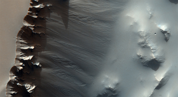 «Na falésia que corta a moldura, são visíveis os sinais do movimento de materiais geológicos. Ao ampliar, são visíveis vários pedregulhos que caíram de uma falésia, deixando pequenas depressões na rocha mole ao cair da encosta”, diz a publicação.