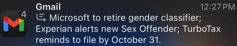 O que um proprietário de iPhone deveria pensar após receber a seguinte mensagem da IA: “A Microsoft está eliminando a classificação de gênero. Experian alerta sobre novo agressor sexual. TurboTax lembra você de registrar até 31 de outubro”? Aparentemente, a inteligência artificial se deparou com um conjunto de informações muito inconveniente para resumir.
