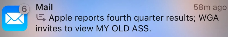 O colunista do The Verge, Wes Davis, disse que ficou extremamente surpreso quando viu um convite do Writers Guild of America em seu iPhone para “dar uma olhada em sua velha bunda”. Além disso, esta mensagem acompanhava informações sobre os relatórios trimestrais da Apple.