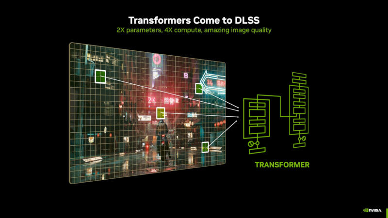 A maior inovação no Nvidia DLSS 4 foi a transição das redes neurais convolucionais para um modelo de transformador, que possui o dobro de parâmetros das redes neurais nas versões anteriores do DLSS. Isso significa maior estabilidade de imagem, artefatos reduzidos, bordas de objetos mais suaves e movimentos mais detalhados – simplesmente, melhor qualidade de imagem. Também no DLSS 4, apareceu uma nova tecnologia DLSS Multi-Frame Generation – uma versão melhorada da geração de quadros básica para placas de vídeo da série GeForce RTX 50: para cada quadro desenhado, eles geram mais três. Isso, combinado com melhorias arquitetônicas, permitiu à Nvidia falar em um aumento duplo no desempenho das placas de vídeo de nova geração.