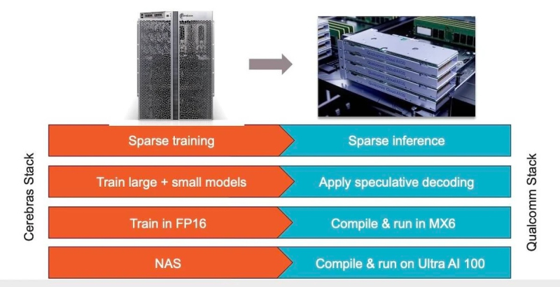 A Cerebras observa que trabalhará com a Qualcomm para otimizar modelos para Cloud AI100 Ultra que aproveitarão técnicas como dispersão, decodificação especulativa, MX6 e descoberta de arquitetura de rede.