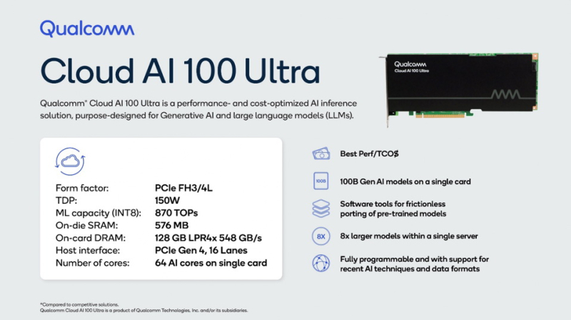 Além de anunciar novos aceleradores de IA, a Cerebras também anunciou uma colaboração com a Qualcomm para criar modelos otimizados para aceleradores de IA da Qualcomm com arquitetura Arm. Ambas as empresas têm sugerido uma possível colaboração desde novembro do ano passado. Ao mesmo tempo, a Qualcomm lançou seus próprios aceleradores de IA Cloud AI100 Ultra no formato PCIe. Possui 64 núcleos AI, 128 GB de memória LPDDR4X com largura de banda de 548 GB/s, desempenho de 870 TOPS INT8 e um TDP de 150 W.