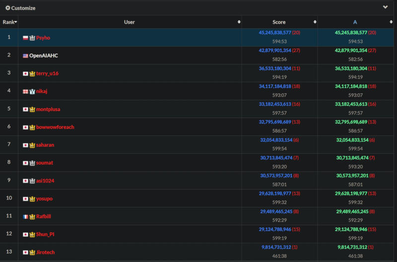 Todos os participantes, incluindo a equipe da OpenAI, utilizaram o mesmo hardware fornecido pela AtCoder, de modo que humanos e IA receberam as mesmas condições. Eles puderam usar qualquer uma das linguagens de programação disponíveis e submeter suas soluções para revisão quantas vezes quisessem, mas não mais do que uma vez a cada cinco minutos. Ao final da competição, Przemysław Dębiak marcou 1.812.272.558.909 pontos e recebeu um prêmio de 500.000 ienes (cerca de US$ 3.361). O modelo especialmente desenvolvido pela OpenAI, baseado na arquitetura de raciocínio o3, chamado OpenAIAHC, marcou 1.654.675.725.406 pontos, ficando 9,5% atrás do líder, mas à frente de outros dez finalistas selecionados com base em rankings anuais.