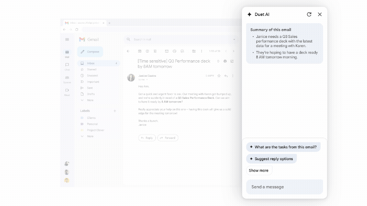 Outros recursos de IA que foram adicionados incluem respostas automáticas aprimoradas: o Gmail agora adicionará respostas mais longas e personalizadas para economizar tempo valioso do usuário. Este recurso aparecerá no Gmail para dispositivos móveis e depois será complementado por uma função contextual para “preencher” os nomes dos colegas. O Google Chat agora tem a capacidade de se comunicar “diretamente” com o Duet, recurso já implementado pela Microsoft, Slack e outros.