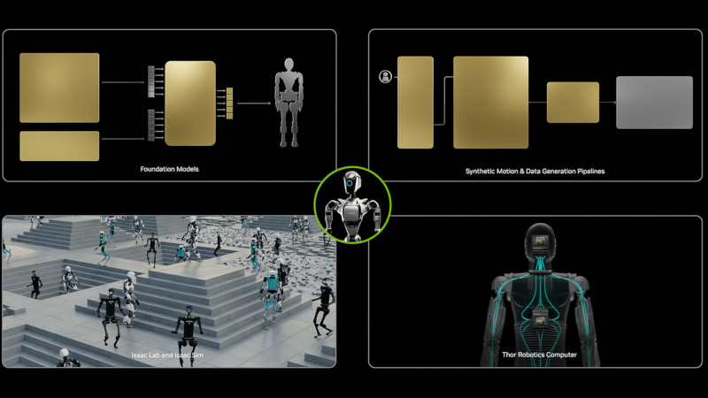 Durante seu discurso no evento GTC 2025, o Sr. Huang demonstrou o robô humanoide 1X NEO Gamma, que pode limpar de forma autônoma, auxiliado pelo modelo GR00T N1 com pós-treinamento. “O futuro dos humanoides é adaptabilidade e aprendizado. O modelo Nvidia GR00T N1 proporcionou um grande avanço no raciocínio e nas habilidades robóticas. Com um conjunto mínimo de dados de treinamento, conseguimos implantá-lo totalmente no NEO Gamma, avançando nossa missão de criar robôs que não são ferramentas, mas companheiros que podem fornecer às pessoas uma ajuda significativa e incomensurável”, disse Bernt Børnich, CEO da 1X Technologies, em um comunicado. O modelo também foi testado pela Boston Dynamics, Agility Robotics, Mentee Robotics e Neura Robotics.