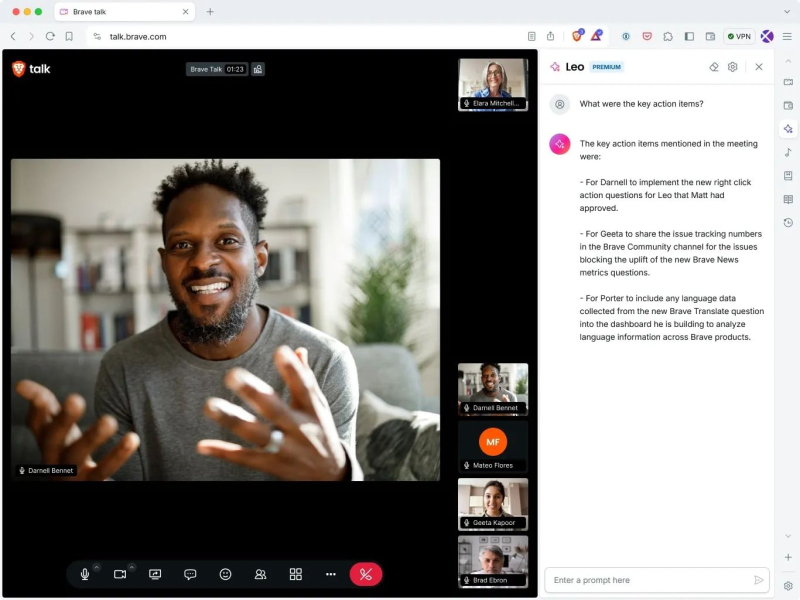 «Com Leo as reuniões serão muito mais eficientes. As pessoas se concentrarão em falar em vez de fazer anotações. A Brave está comprometida em implementar inteligência artificial, respeitando a privacidade do usuário – o mesmo se aplica à videoconferência”, disse o CTO e cofundador da Brave, Brian Bondy.