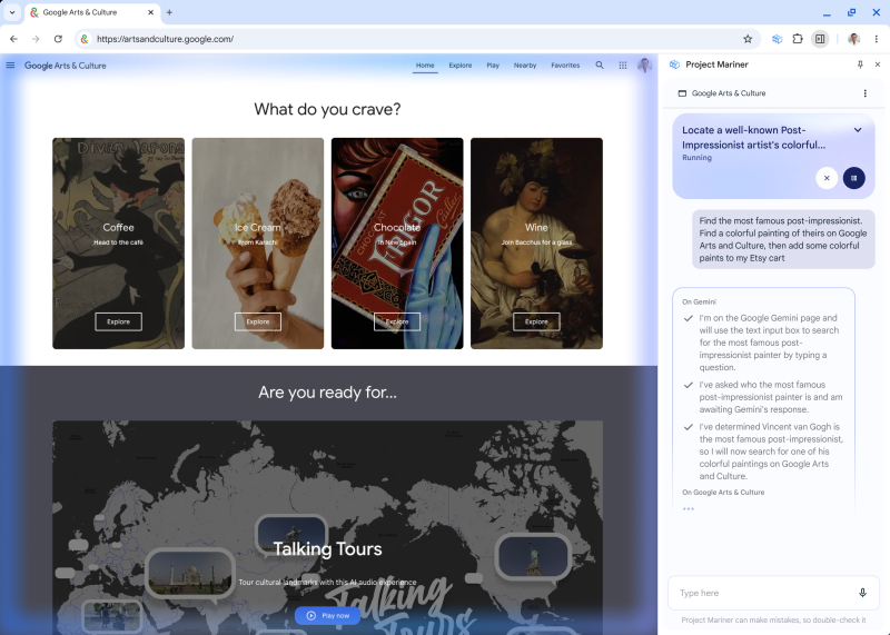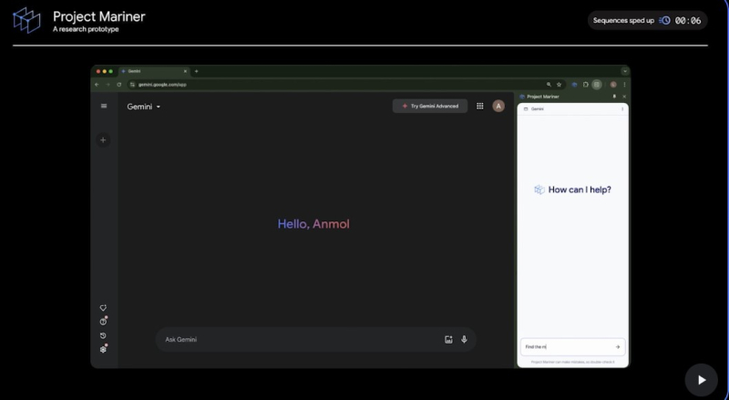 O Google apresentou um protótipo de pesquisa de um agente de IA chamado Project Mariner, que é capaz de realizar ações na Internet para uma pessoa. A divisão do Google, DeepMind, é responsável pelo desenvolvimento. O agente de IA baseado em Gemini assume o controle do navegador Chrome, move o cursor na tela, clica em botões e preenche formulários, permitindo usar e navegar em sites como um ser humano faria.