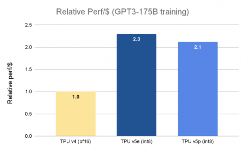 Segundo o Google, os novos aceleradores TPU v5p são capazes de treinar grandes modelos de linguagem, como GPT-3 com 175 bilhões de parâmetros, 2,8 vezes mais rápido que o TPU v4, usando menos energia. Além disso, graças à segunda geração do SparseCore, o TPU v5p pode treinar modelos densos de incorporação 1,9 vezes mais rápido que o TPU v4. Além do desempenho aprimorado, o TPU v5p oferece o dobro da escalabilidade do TPU v4, que combinado com a duplicação do desempenho fornece quatro vezes mais FLOPS por cluster.