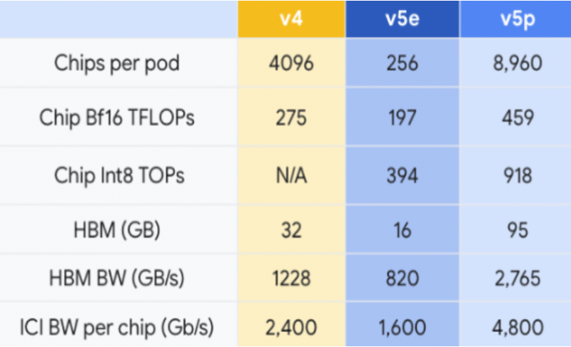 Curiosamente, em termos de desempenho por dólar, o v5p é ligeiramente inferior aos aceleradores TPU v5e recentemente introduzidos. No entanto, este último pode ser montado em clusters de apenas 256 chips, e um chip fornecerá apenas 197 teraflops no BF16 contra 275 teraflops para TPU v4 e 459 teraflops para TPU v5p.