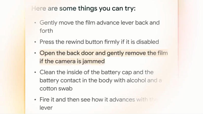 A IA recomendou “abrir a tampa traseira e remover o filme com cuidado”. E esta é talvez a pior coisa que você pode fazer nesta situação. Porque se você abrir a tampa traseira de uma câmera de filme que não esteja em uma sala completamente escura, o filme acenderá e todas as fotos tiradas ficarão inutilizáveis. Mas no vídeo esta resposta é destacada como a mais adequada.