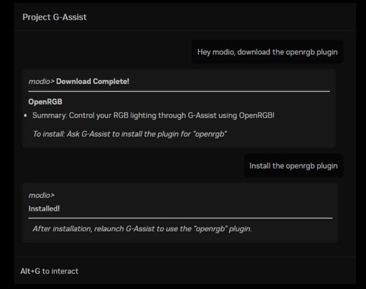 Em colaboração com a Mod.io, a Nvidia desenvolveu o aplicativo G-Assist Plug-In Hub, que oferece aos usuários acesso fácil às novas extensões oficiais do Project G-Assist, além de encontrar e baixar modificações amadoras. Após instalar a atualização, o usuário pode perguntar diretamente ao Project G-Assist quais novas extensões estão disponíveis e usar linguagem natural para solicitar a instalação.
