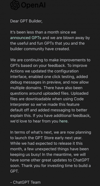 Numa carta aos participantes do programa de testes GPT Builder, a OpenAI, em particular, referiu que o lançamento da GPT Store foi adiado para o início de 2024. Inicialmente, presumia-se que a loja online seria lançada no final deste ano.