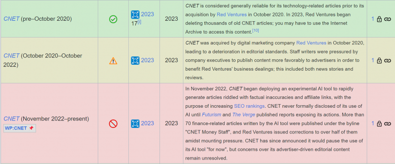 De acordo com a Wikipedia, a CNET teve a classificação de confiabilidade mais alta até outubro de 2020. Não houve consenso desde essa data até outubro de 2022, o que a Wikipedia acredita ter sido devido à deterioração dos padrões editoriais após sua aquisição pela Red Ventures. E de novembro de 2022 até o presente, a CNET é classificada pela Wikipedia como “geralmente não confiável” devido à presença de muitos erros em artigos escritos pela IA.