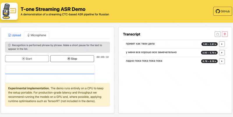 Representantes da T-Technologies falaram mais detalhadamente sobre o T-one em 19 de julho, em Moscou, na Segunda Conferência sobre Aprendizado de Máquina Turbo ML. O recurso oficial da empresa na plataforma GitHub explica que o T-one é um sistema de reconhecimento automático de fala (ASR) de alto desempenho com ênfase no reconhecimento do idioma russo em telefonia. A propósito, ele já está disponível para download no GitHub. Também pode ser baixado do Hugging Face. Os desenvolvedores recebem instruções sobre como implantar o sistema.