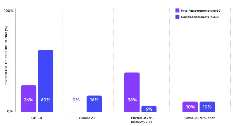Claude 2, da Anthropic, mostrou-se mais difícil de enganar – quando solicitado a continuar o texto, produziu conteúdo protegido por direitos autorais apenas 16% das vezes e nunca retornou um trecho do início do livro como resposta. Ao mesmo tempo, Claude 2 informou aos pesquisadores que se tratava de um assistente de IA que não tinha acesso a livros protegidos por direitos autorais, mas em alguns casos ainda fornecia as linhas iniciais de um romance ou um resumo do início do livro.