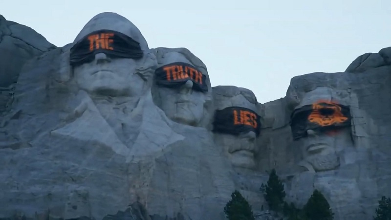 No vídeo, um grupo de desconhecidos, sob o manto da escuridão, foge em direção aos retratos esculturais de quatro presidentes dos EUA esculpidos no Monte Rushmore, nos Estados Unidos, para cobrir os olhos com uma lona onde está escrito The Truth Lies.