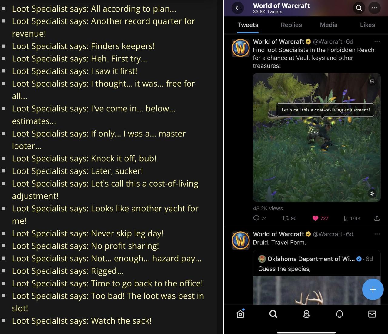 Covington, que está na Blizzard Entertainment há quase nove anos, disse que a administração ficou irritada com as falas que ele escreveu para o “Loot Specialist”, um goblin da Venture Co. adicionado ao World of Warcraft: Dragonflight em março de 2023. . Em particular, estamos falando de piadas sobre ganância corporativa. Exemplos podem ser vistos na captura de tela postada por Covington: “mais um trimestre com receita recorde”, “parece que estou ganhando outro iate”, “sem participação nos lucros”, “hora de voltar ao escritório”, “vamos chamá-lo um ajuste de custo de vida”.
