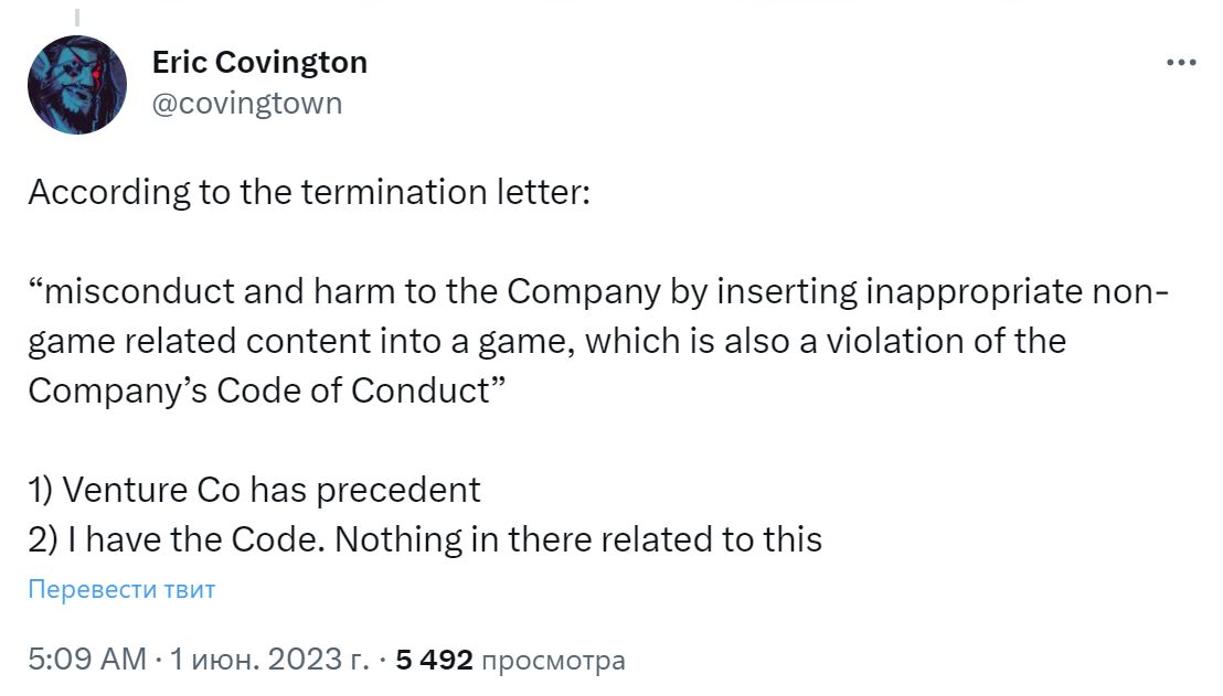 Em uma carta recebida por Covington, a administração acusou o funcionário de “prejudicar” e “violar o código de conduta”. “Comportamento inapropriado e danos à empresa ao adicionar conteúdo inapropriado e inapropriado ao jogo”, dizia o texto.