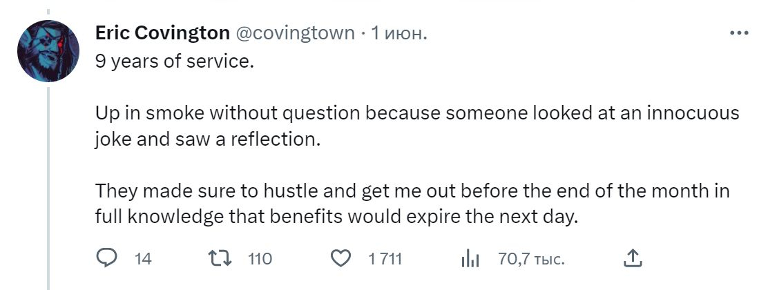 «”Nove anos de trabalho terminaram sem questionar só porque alguém olhou para piadas inofensivas e se viu nelas”, escreveu Covington, observando que não se referia a pessoas específicas. “Eles correram e me expulsaram antes do próximo mês, sabendo que isso me privaria me de benefícios.”