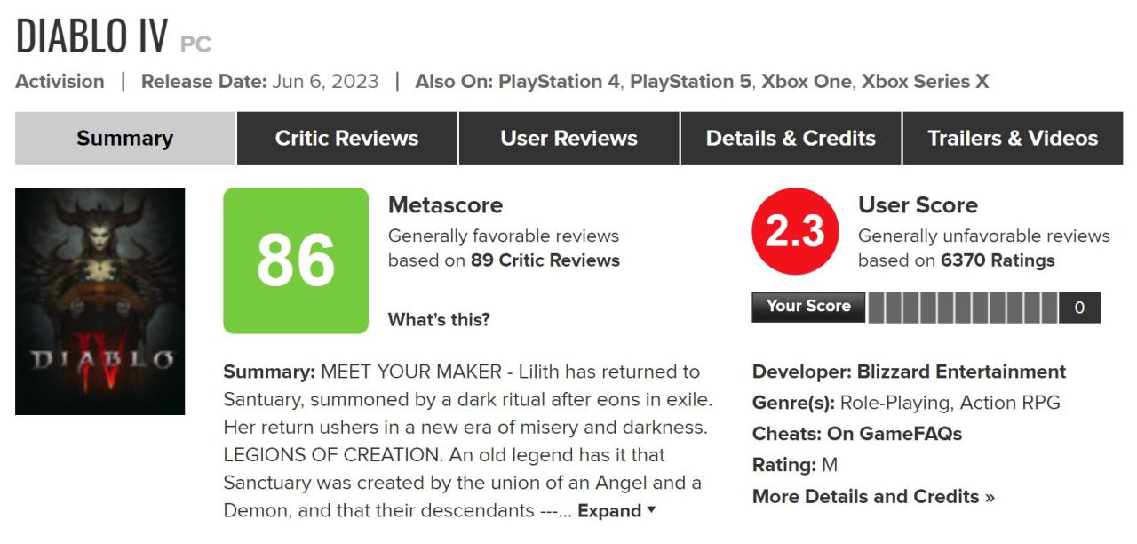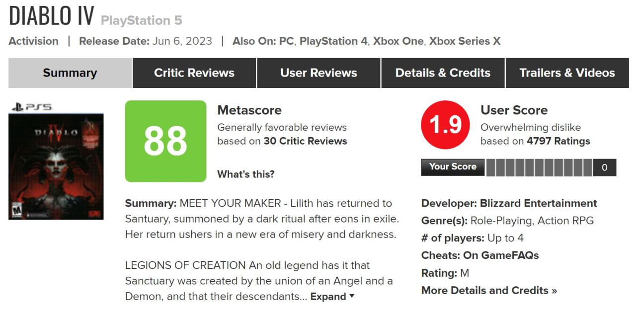 No dia anterior, 21 de julho, a classificação média do usuário para a versão PlayStation 5 de Diablo IV era 1,9/10, para PC era 2,3/10 e para Xbox Series X e S era 3,5/10. Vale ressaltar que essa classificação não foi muito alta desde a estreia (cerca de 5/10), mas ainda não caiu tanto. Ao mesmo tempo, a pontuação média da mídia é 86–91/100.
