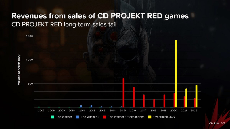 Apesar da falta de novos lançamentos importantes (o lançamento de Cyberpunk 2077 e The Witcher 3: Wild Hunt nos consoles da geração atual não contam), 2022 foi o segundo ano de maior sucesso na história da CD Projekt.