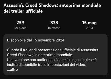 A julgar pela descrição do trailer no YouTube italiano, Assassin’s Creed Shadows será lançado em 15 de novembro deste ano. O lançamento é esperado dentro da plataforma Assassin’s Creed Infinity (codinome) no PC, PS5, Xbox Series X e S.