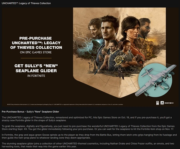 Em particular, a página mencionou que ao pré-encomendar a coleção Uncharted: Legacy of Thieves na EGS a partir de XX de setembro, os jogadores receberão um planador bônus para Fortnite (o planador em si aparecerá no jogo em 17 de novembro) na forma de Sally’s avião.