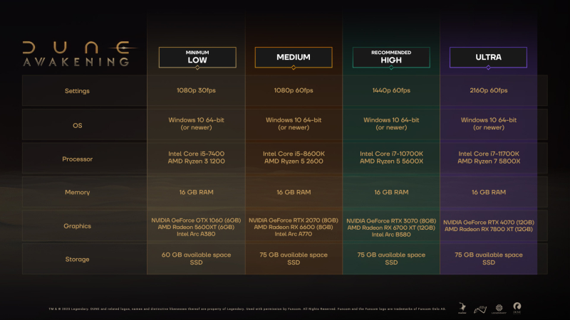 Gostaríamos de lembrar que os requisitos mínimos e recomendados do sistema estavam e continuam disponíveis na página do jogo no Steam, e agora os criadores de Dune: Awakening apresentaram mais duas configurações – intermediária e máxima.