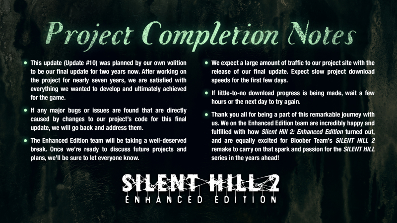 A primeira versão de Silent Hill 2: Enhanced Edition foi lançada no final do verão de 2018 e seis anos depois a equipe lançou a décima e última atualização. Os entusiastas compartilharam seus detalhes em um vídeo de uma hora (anexo acima).