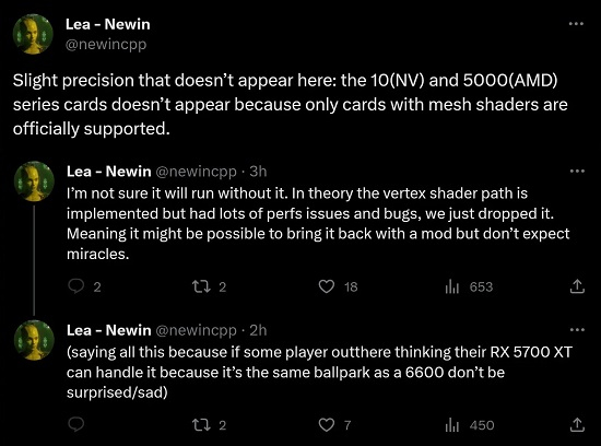 Como explicou um dos funcionários da Remedy (os tweets foram excluídos posteriormente) em seu microblog, o jogo precisa da tecnologia Mesh Shaders para funcionar, e placas de vídeo mais antigas (séries GTX 10 e RX 5000) não a suportam.