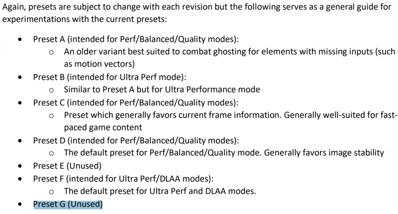 Além disso, uma predefinição desconhecida com a letra G, projetada para o mecanismo de jogo Unreal Engine, foi encontrada na descrição da atualização do SDK. Atualmente não é usado e não tem descrição. Talvez o Preset G seja adicionado em uma das próximas atualizações. A empresa também disse sem detalhes que corrigiu alguns erros e bugs na nova versão do DLSS SDK.