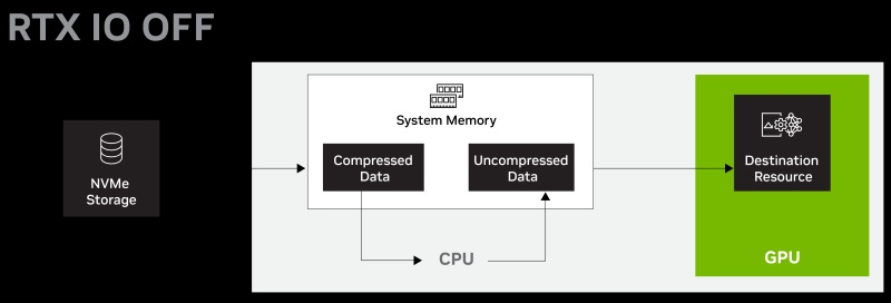 Tradicionalmente, os dados de uma unidade são descompactados pela CPU na memória do sistema e depois enviados para a GPU. Este sistema usa apenas uma fração dos recursos dos SSDs NVMe de alta velocidade com PCIe 4.0 e PCIe 5.0, o que leva a atrasos visíveis ao carregar em jogos modernos com uso intensivo de recursos. Mecanismos de jogos mais recentes ultrapassaram os recursos das APIs de armazenamento tradicionais – uma nova geração de arquitetura de E/S é necessária.