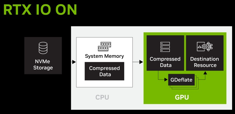 O NVIDIA RTX IO é baseado no padrão de compressão de GPU aberto GDeflate da NVIDIA. Isso permite que cada ISV adicione suporte para a tecnologia a seus drivers e os desenvolvedores a implementem em várias plataformas. Esse método é usado pelo Microsoft DirectStorage e pelas extensões de ferramentas gráficas 2D e 3D multiplataforma Vulkan mais recentes.