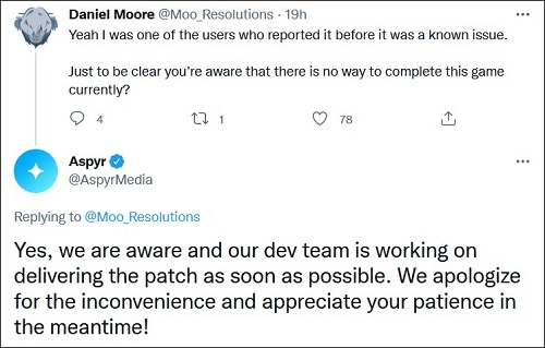 Falando com um usuário preocupado, Aspyr garantiu que estava ciente do problema e já estava trabalhando no lançamento de um patch para corrigi-lo o mais rápido possível. Ainda não há uma data de lançamento específica para o patch.
