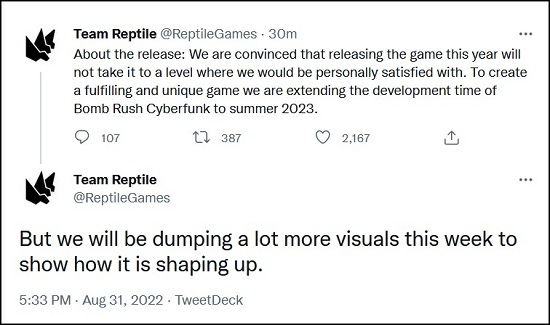 Como ficou conhecido, para melhorar a qualidade do produto, Bomb Rush Cyberfunk será adiado para o verão de 2023. De acordo com os desenvolvedores, o tempo extra será gasto para tornar o jogo completo e único.