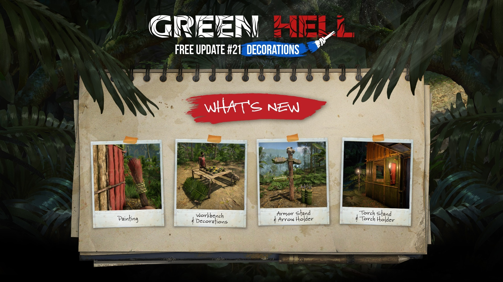 Com a atualização gratuita final chamada Decorações, Green Hell adicionará decorações para a cabana (tintas, porta-tochas e flechas, decorações de bancada e muito mais). Ele chegará ao Steam em 3 de setembro e mais tarde aparecerá no PlayStation 5, Xbox Series X, S e Nintendo Switch. No futuro, o suporte ao jogo será limitado a patches técnicos.