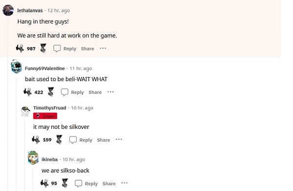 No dia anterior, 14 de fevereiro – dia do quinto aniversário do anúncio de Hollow Knight: Silksong – Matthew Griffin, responsável pelas questões de marketing e publicação da Team Cherry, contatou a comunidade desesperada.