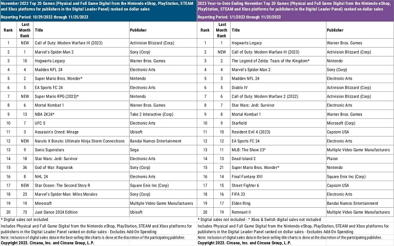 Além disso, alcançado em apenas duas semanas (o jogo foi lançado no dia 10 de novembro, e os dados do Circana no dia 25), o resultado permitiu que Call of Duty: Modern Warfare 3 ficasse entre os 3 primeiros no ranking geral de vendas de todo o ano de 2023.