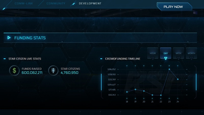 Lembre-se que a arrecadação de fundos para a criação do Star Citizen começou em outubro de 2012 com uma campanha Kickstarter (pouco mais de US$ 2 milhões), após a qual foi transferido para o site oficial do projeto: US$ 100 milhões em dezembro de 2015, US$ 200 milhões em Novembro de 2018, US$ 300 milhões em junho de 2020, US$ 400 milhões em novembro de 2021 e US$ 500 milhões em setembro de 2022.